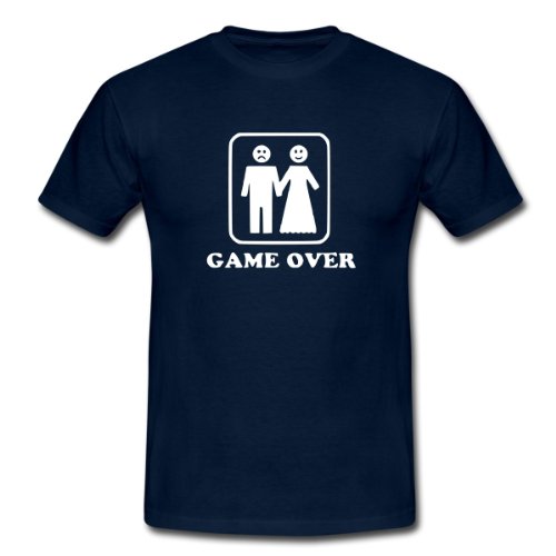 #game over, mariage, fiançalle, fiançailles. Le classique: ce tee shirt pour hommes à coupe droite est composé de coton filé pré-rétréci. La double couture en bas des manches, à la base et au col, garantit sa qualité et sa bonne finition. Confort garanti. Grammage: 190g/m². Composition 100% coton. Après confirmation de commande nous imprimons le produit individuellement pour toi. Ainsi, nous fabriquons des pièces uniques qui font vraiment plaisir à nos clients et soit dit en passant, nous préservons l''environnement.